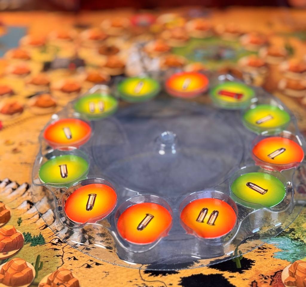 - 12 عدد توکن چرخونه ( 1 دینامیت، 2 عدد دو گلوله، 9 عدد تک گلوله)