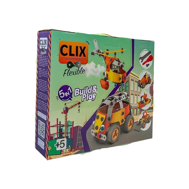یکی از مدلهای ساختنی برند کلیکس مدل فلکسیبل آن است. این محصول از 148 قطعه مختلف شامل قطعات و پیچها و مهرهها تشکیل شده است. کودکان با کمک 148 قطعه داخل این بسته بندی میتوانند 5 مدل خودرو و هواپیما مختلف را بسازند. توجه کنید که داخل بستهبندی این محصول یک دفترچه برای راهنمایی کردن کودکان وجود دارد که میتوانند جهت ساخت و ساز از آن کمک بگیرند.