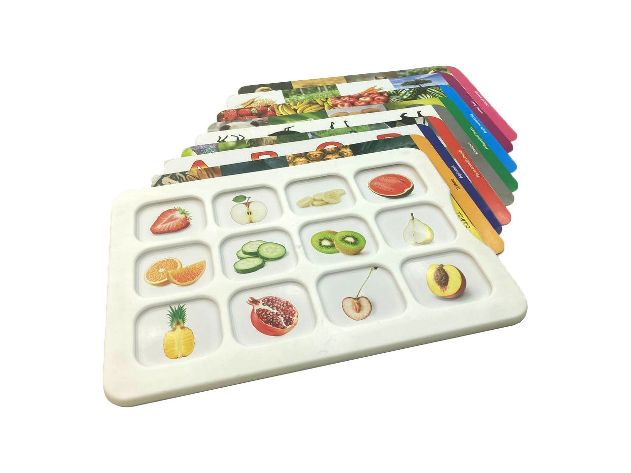 هر بار یکی از کارتها را داخل صفحهی پلاستیکی قرار بدین. از کودک بخواین صفحه رو با تشکهای مشابه تصاویر پر کنه.